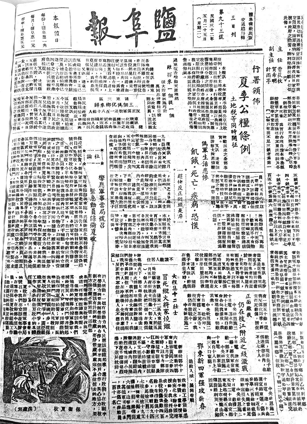 1943年5月25日《盐阜报》社论刊发《响应军事当局号召 紧急动员保卫夏收》。
