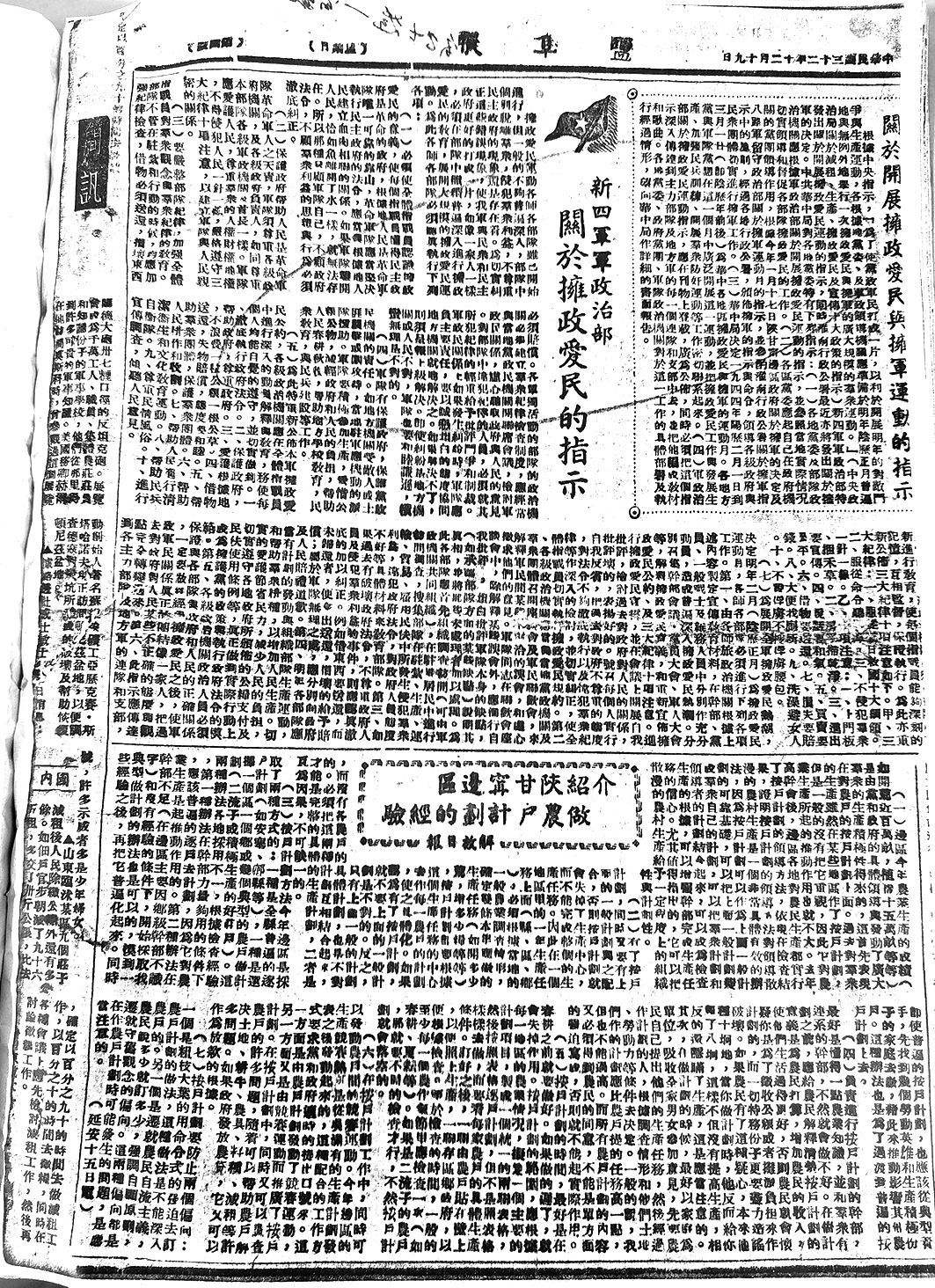 1943年12月19日《盐阜报》刊发了《新四军政治部 关于拥政爱民的指示》
