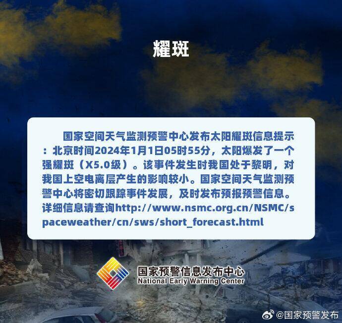 据国家空间天气监测预警中心发布太阳耀斑信息提示:北京时间2024年1月1日5时55分,太阳爆发了一个强耀斑(X5.0级)。该事件发生时我国处于黎明,对我国上空电离层产生的影响较小。而且本次爆发位置不正对地球,不会造成大的地球空间环境效应。