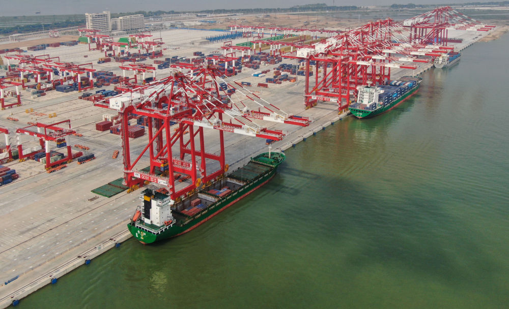 这是2022年7月28日拍摄的广州港南沙港区四期全自动化码头(无人机照片)。新华社记者邓华摄
