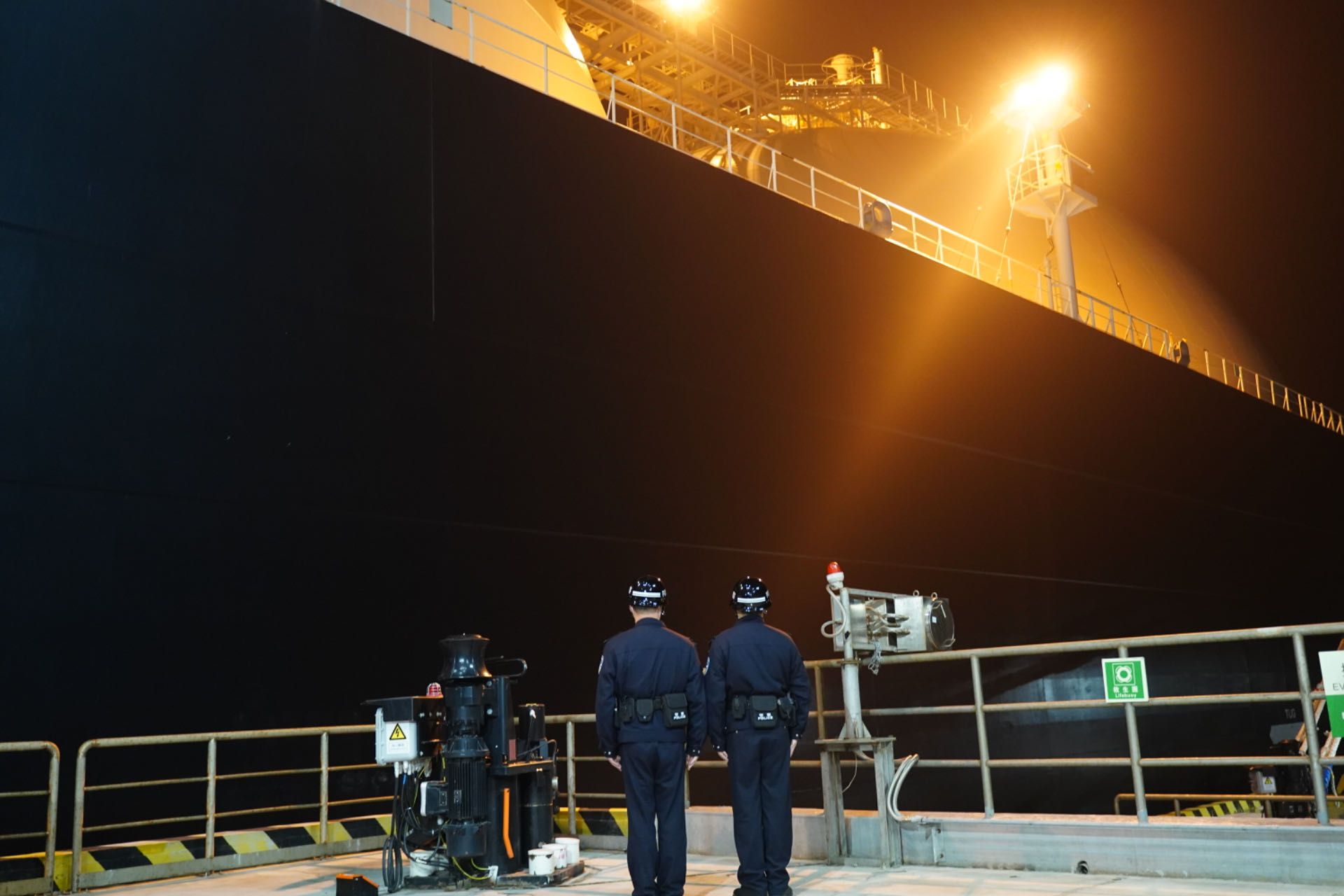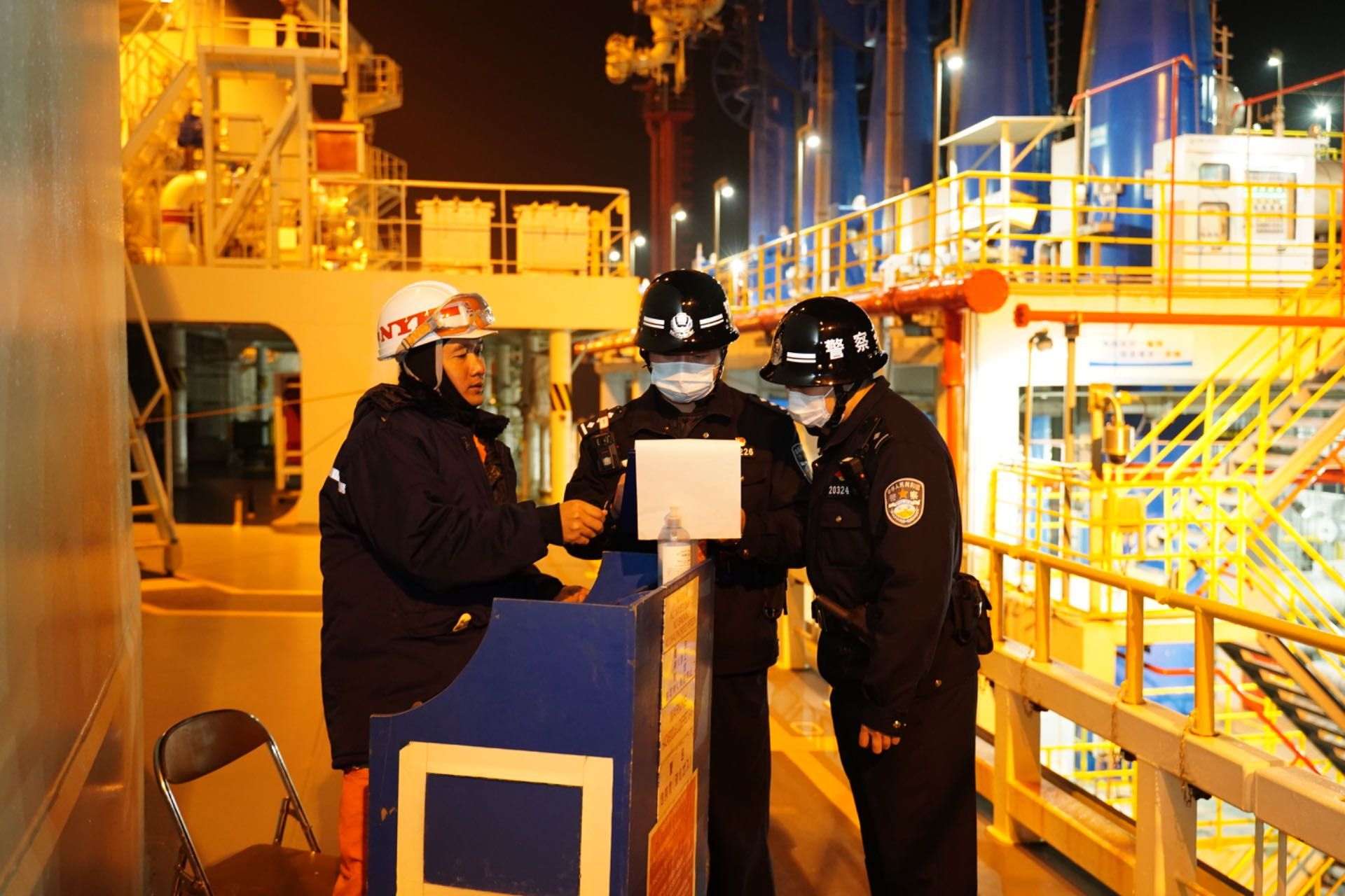 为保证首艘LNG船舶顺畅通关,盐城出入境边防检查站主动对接口岸联检单位、中海油江苏天然气有限责任公司及船舶代理公司,提前掌握首艘船舶动态,提前核实船员信息及船舶轨迹,提前到泊位等候船舶进出港,采用24小时全天候服务模式,“一对一”办理边检通关手续,优化边检手续办理流程,高效完成登轮检查和人证对照,对船舶实施到港“零等待”作业、离港“零延时”验放、保障通关“不打烊”。此外,运用视频智能化系统与人工巡查相结合等手段,确保外轮在港作业期间口岸安全稳定。