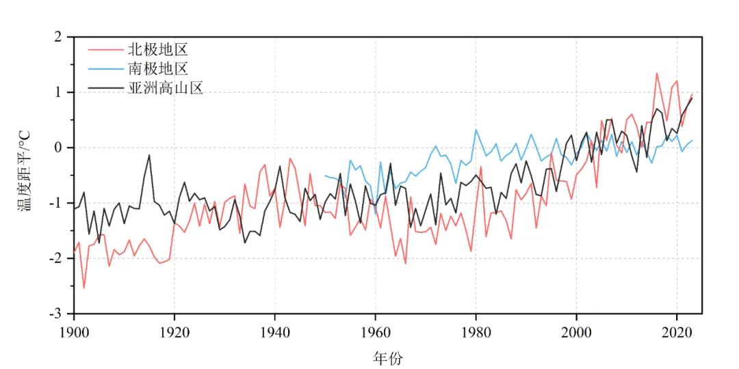 1900年至2023年南、北极地区和亚洲高山区表面平均温度距平(相对1991年至2020年平均值)(基础数据来源:中国气象局全球表面温度月值格点重建数据集V2.0)