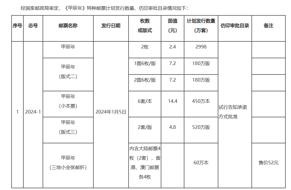 龙年生肖邮票发行量 来源:国家邮政局