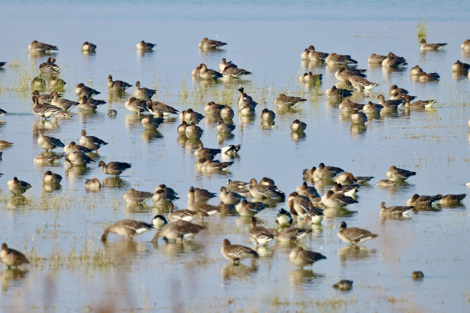 来条子泥越冬的以水鸟居多,雁鸭与鸻鹬类数量占比几乎持平,分别约占总数的36%和39%,鸬鹚数量也接近总数的20%。调查期间,虽然遭遇降温大雾、潮水不高,存在部分计数低估,但也有不少精彩记录。比如,在“明星高潮地”一万亩,至少有28只卷羽鹈鹕在高潮期间停留在塘内休息;大火烈鸟也与往年一样再次回到条子泥,这次共有14只,其中有3只年轻的火烈鸟。而一万亩周边的大片农田以及“720亩”塘的部分干地、空地,则是雁群喜爱的越冬栖息地。本次记录到3000余只雁类,其中的主力是豆雁,也有国家二级保护动物鸿雁、白额雁和小白额雁。