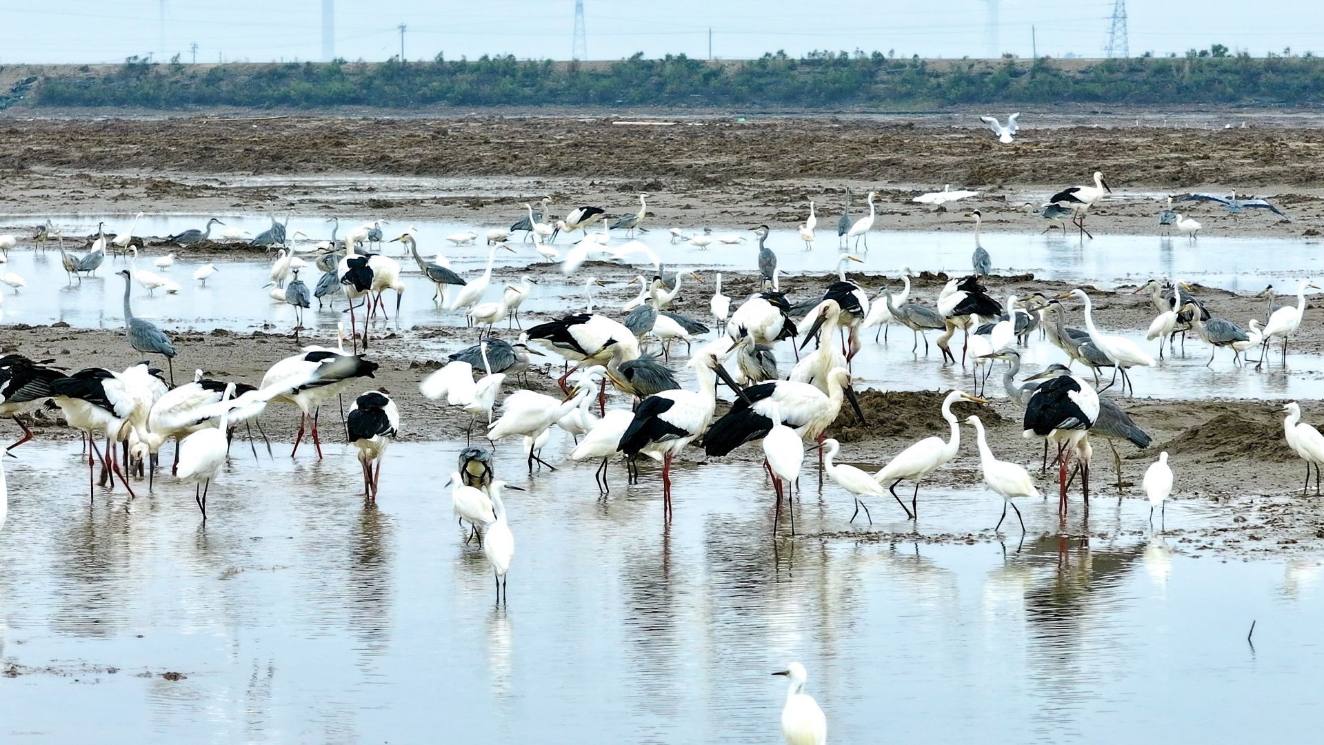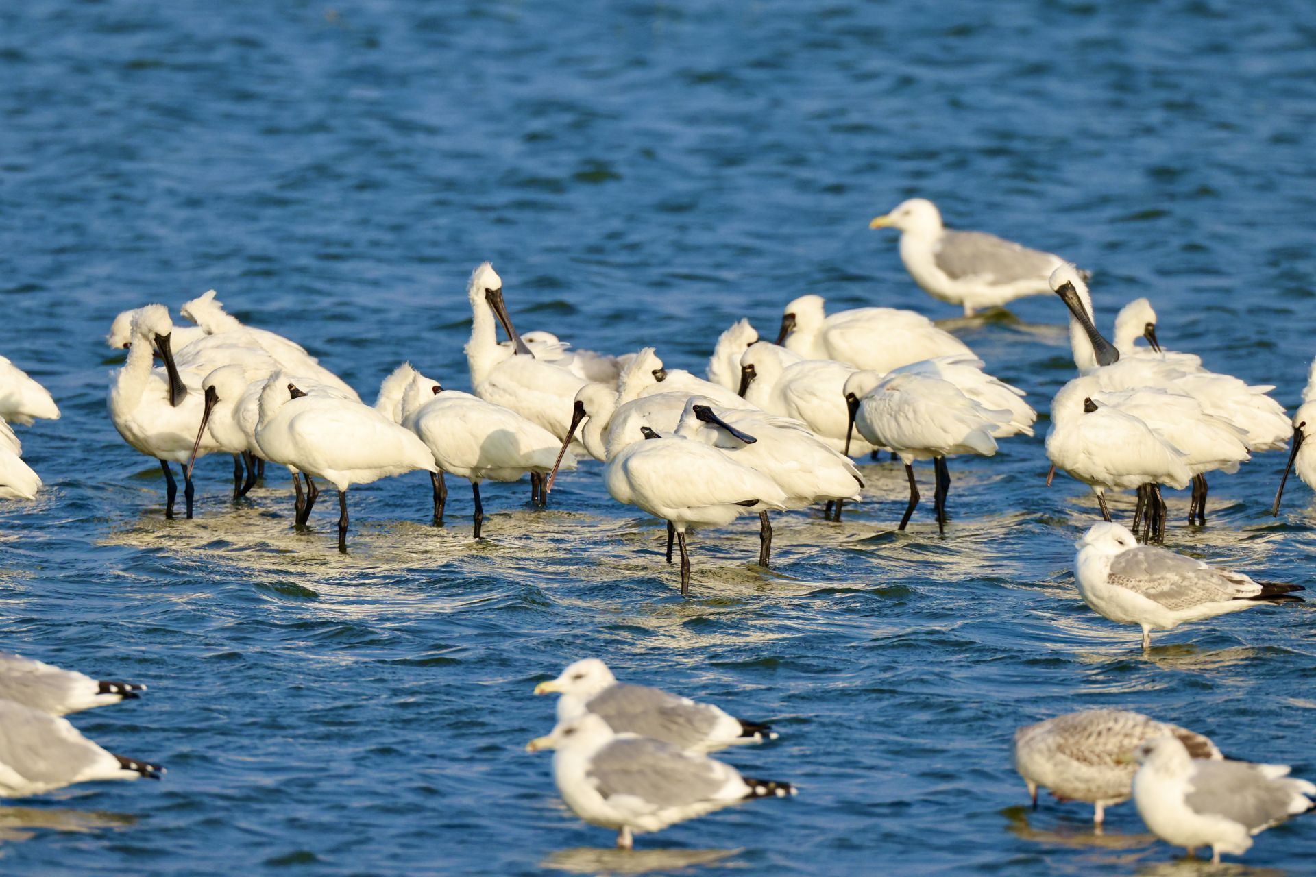 作为东亚——澳大利西亚候鸟迁徙路线上的中心节点和关键区域,条子泥湿地是全球数以百万迁徙候鸟的停歇地、换羽地和越冬地,记录到鸟类种数达412种,被誉为“鸟类的国际机场”。本次调查范围包括条子泥景区西侧的“720亩”塘,梁垛河口及其以南的“一万亩”塘,条南沙洲、方塘河口等地,发现有国家一级重点保护野生动物5种:丹顶鹤、卷羽鹈鹕、黑嘴鸥、东方白鹳和黑脸琵鹭;国家二级重点保护野生动物9种:鸿雁、白额雁、小白额雁、花脸鸭、白秋沙鸭(斑头秋沙鸭)、黑颈䴙䴘、白腰杓鹬、大杓鹬和白琵鹭;此外还观察到国家二级重点保护动物游隼、黑翅鸢和普通鵟。