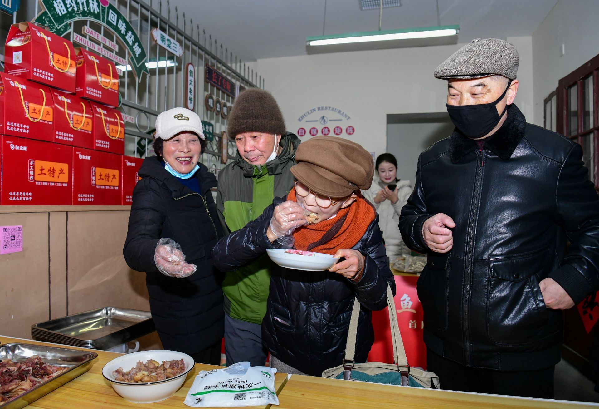 今年83岁的高大爷一大早就带着老伴过来选购年货,才一小会儿的工夫,老人家就买了一大袋马荠菜干和几斤熟牛肉。高大爷笑着说:“回家蒸包子,这些都是我们每年过春节要准备的,一会儿再去看看香肠和肉圆。”老人稍事休息,又走进人群开始了新一轮的采购。