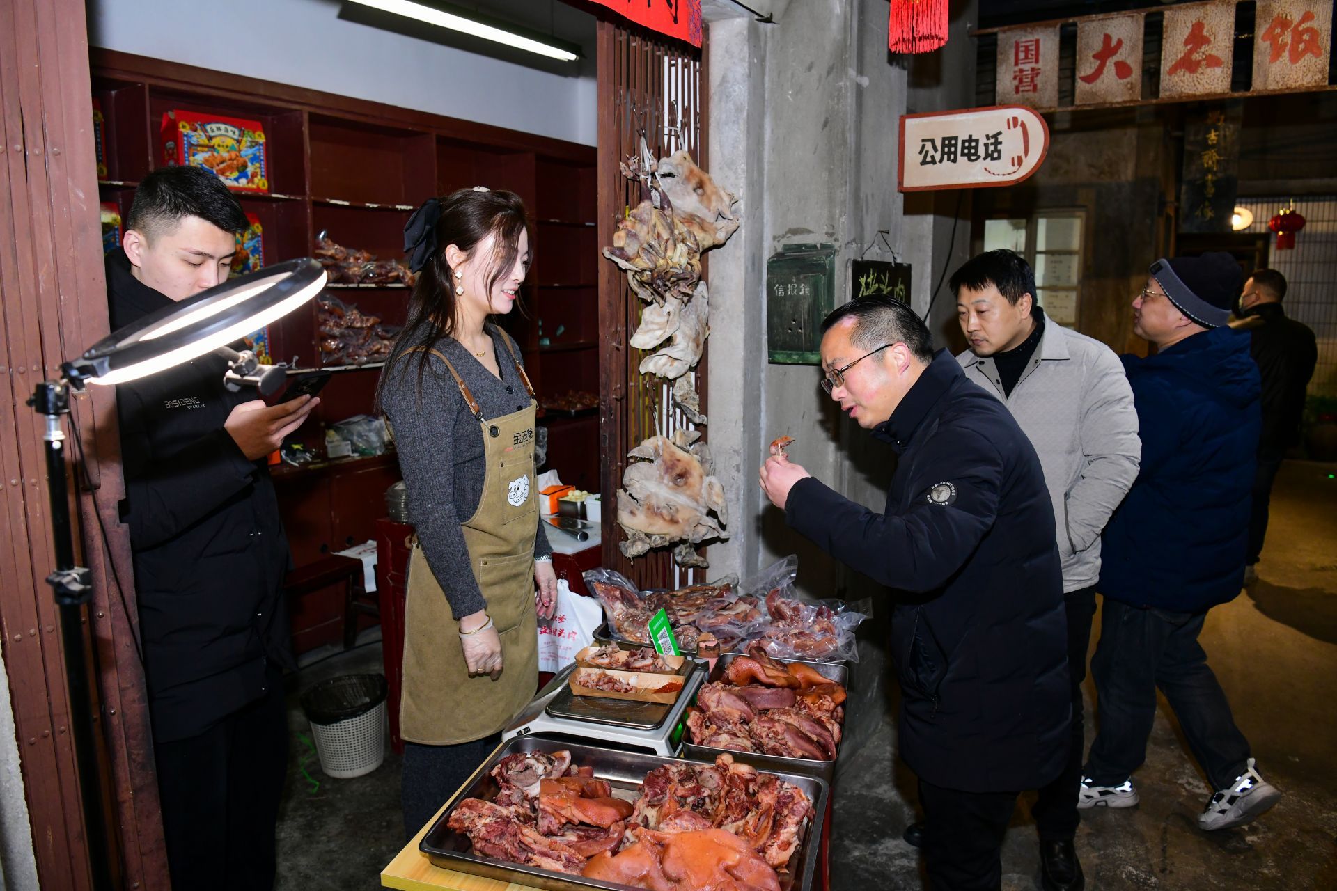 “益林猪头肉”的老板戴磊阳前一天就从阜宁益林赶来布置展位,并连夜赶制出一批卤味供广大顾客选购。在大集现场,她抓住商机架起设备开启了现场直播销售。镜头前的她,一边展示着色泽诱人、香气四溢的猪头肉,一边分享着制作过程和独特风味。这样线上线下的精彩互动,在现场还有很多。