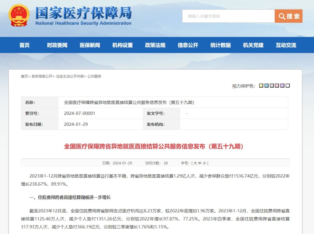 2023年1-12月跨省异地就医直接结算运行基本平稳,跨省异地就医直接结算1.29亿人次,减少参保群众垫付1536.74亿元,分别较2022年增长238.67%、89.91%。