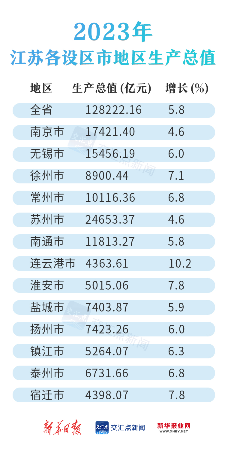 交汇点讯 2月6日,记者从江苏省统计局获悉我省各设区市的地区生产总值情况。整体来看,根据地区生产总值统一核算结果,2023年江苏GDP实现128222.16亿,同比增长5.8%。江苏13个设区市中有5个市GDP总量超万亿元,江苏也成为首个拥有5座万亿城市的省份。