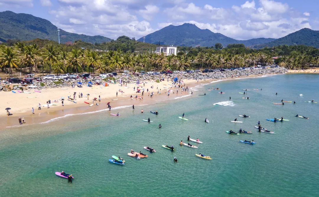△2月17日,海南琼海,大批游客在万宁市日月湾海滨冲浪戏水。