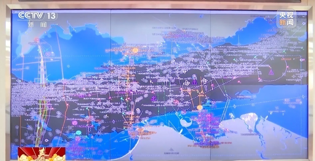 △在琼州海峡船舶交通管理中心的高清大屏幕上,琼州海峡中的航道航线密集显示,穿越海峡的船舶化作一枚枚不同颜色的小三角标识,实时标注在深蓝色海图上。