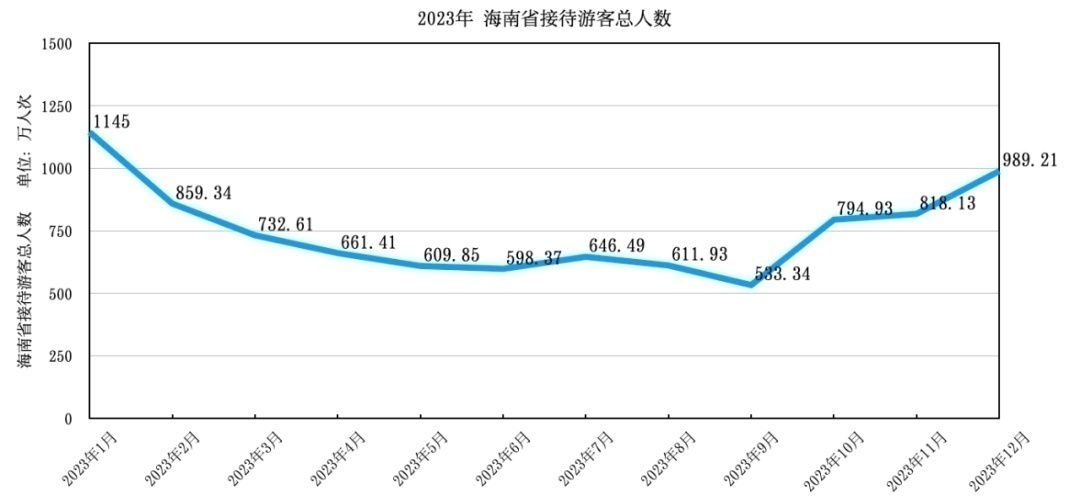 据海南省旅游和文化广电体育厅公布的数据,2023年,海南省旅游人数最高峰出现在1月,也是春节假期期间,接待游客总人数达到1145万人次;最低的时候是9月,接待游客总人数为533.34万人次。