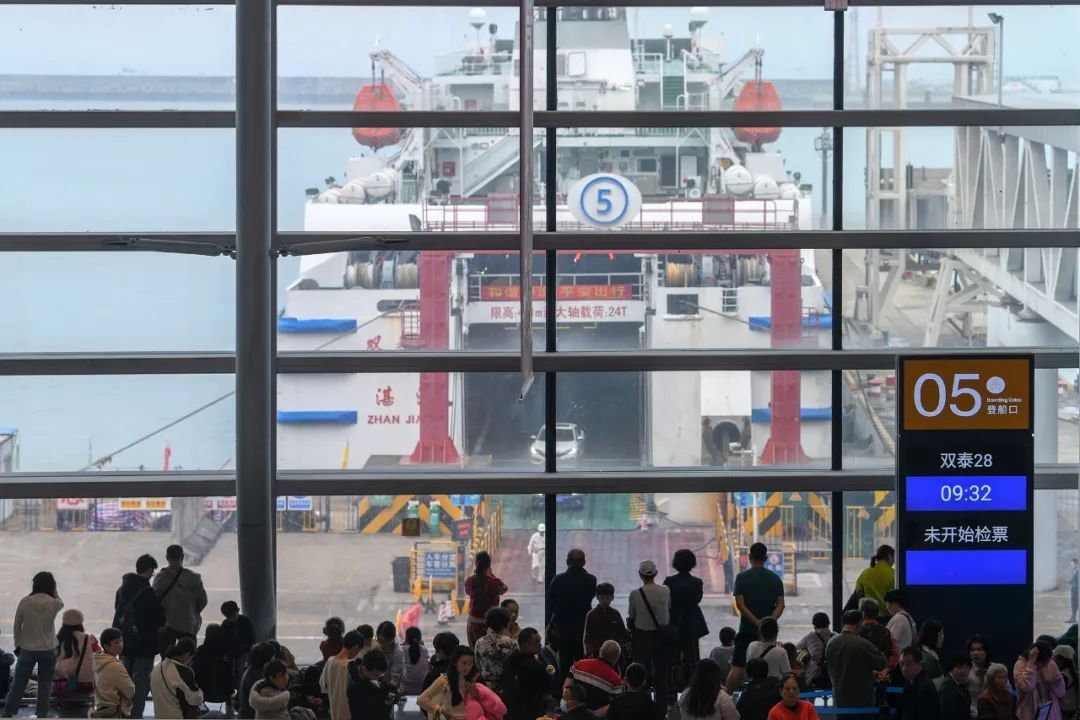 △2月16日,海口新海客运综合枢纽候船大厅,准备排队登船的游客隔窗望向码头轮渡。