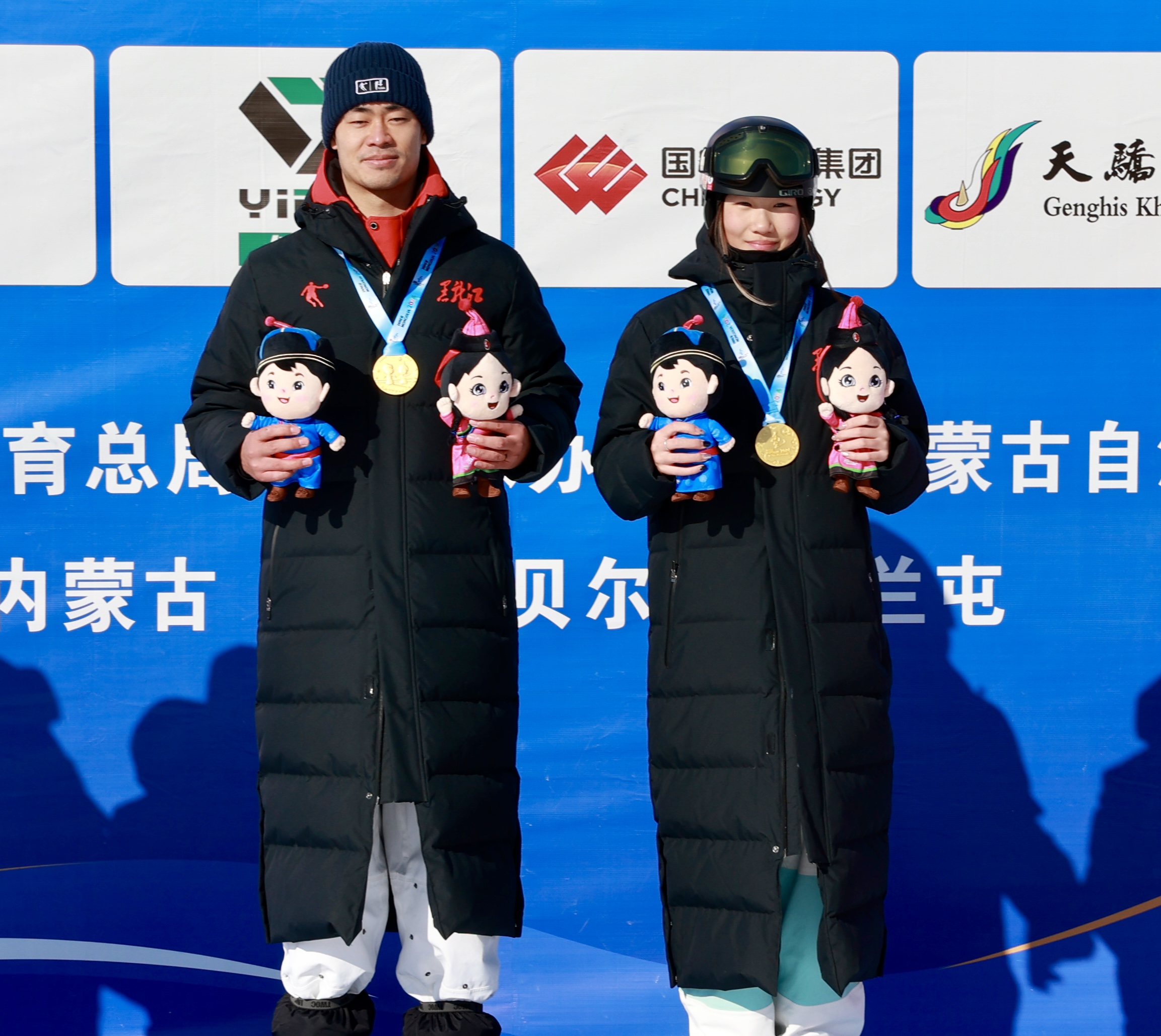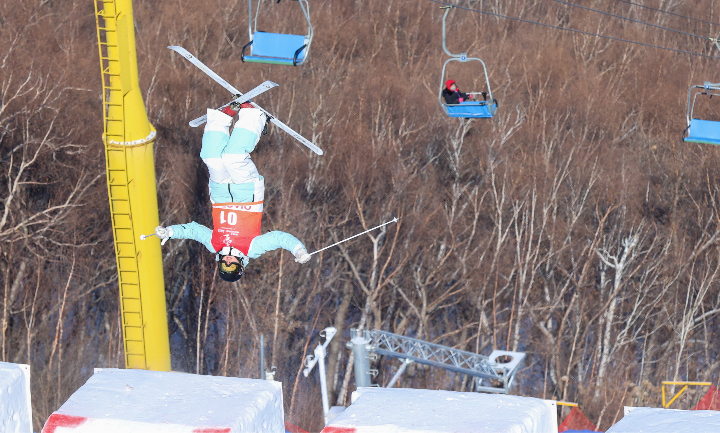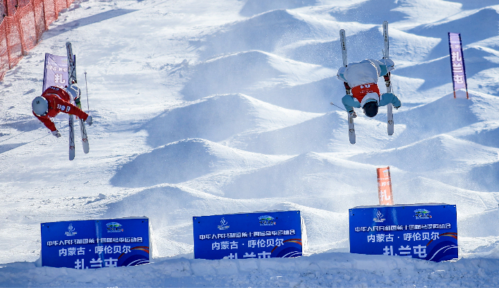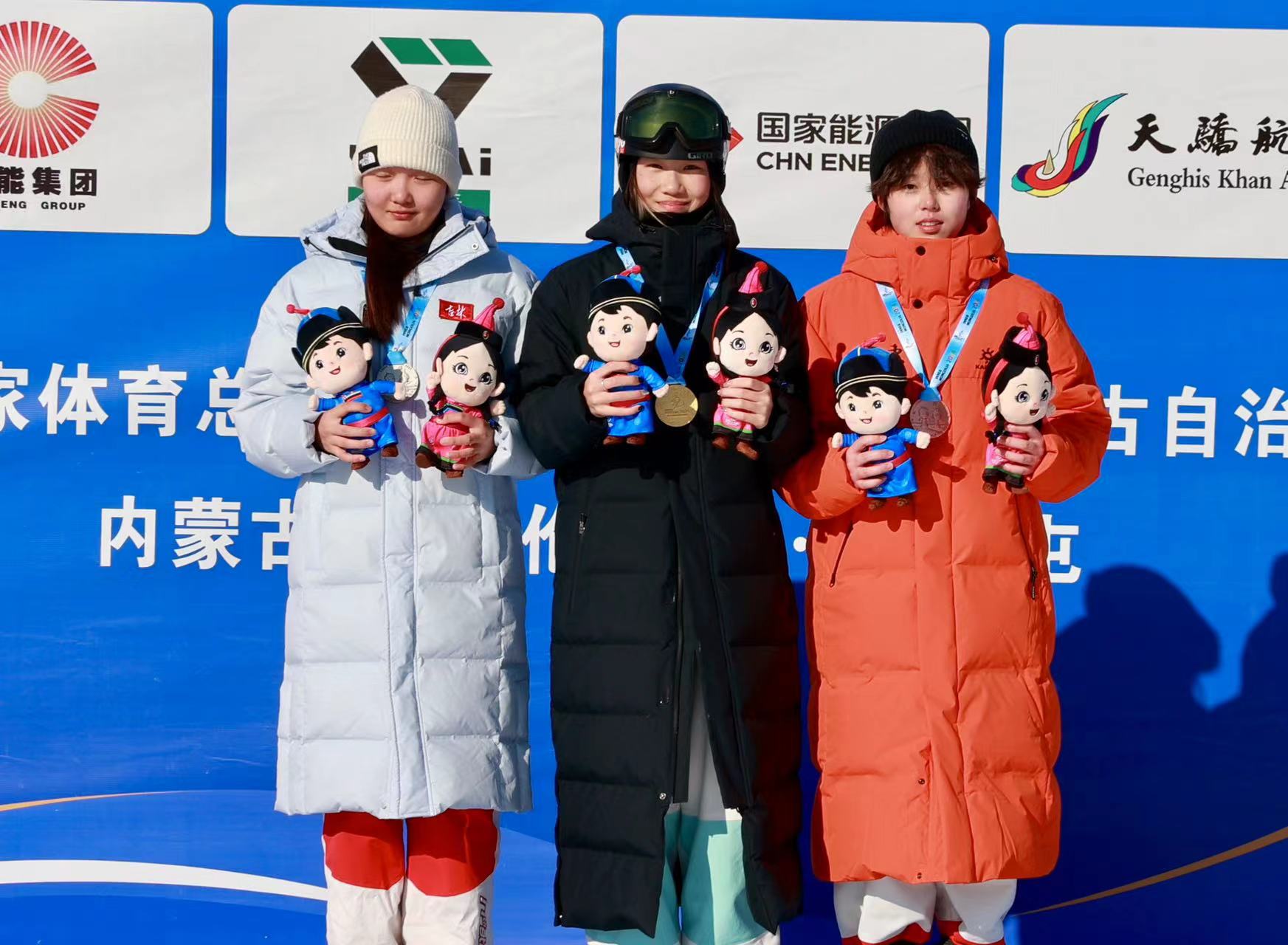 由黑龙江省和江苏省联合培养运动员杨丫(中)在公开组女子双人雪上技巧决赛中夺冠 黄夕寅 摄