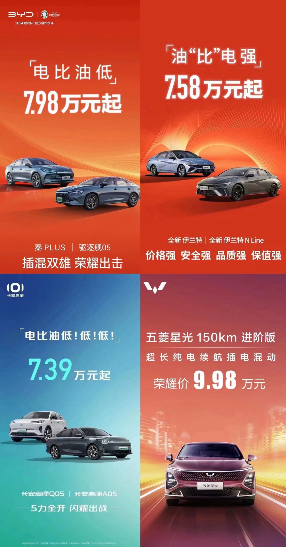 昨日,比亚迪率先打出了“电比油低”的口号,其实已经不是卷新能源汽车了,而是卷油、电所有车型了。比亚迪秦PLUS、驱逐舰05推出荣耀版,起售价仅7.98万元,随后五菱星光、长安启源、深蓝S7纷纷点击“跟随”,而燃油车方面,率先反击的是北京现代伊兰特,但是反击只体现在口号“油比电强”,价格方面依然是点击降价“跟随”。