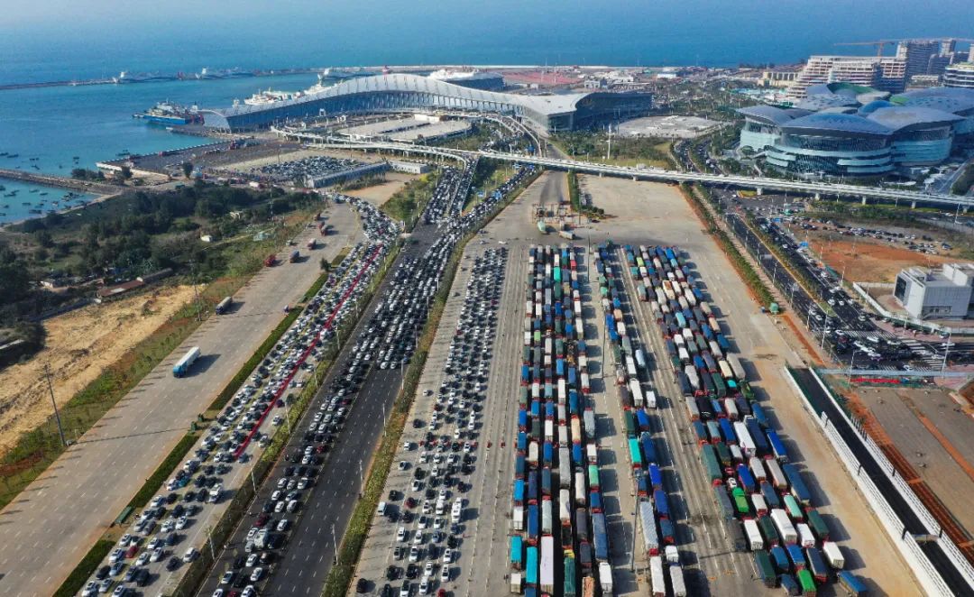 2月17日,大批车辆在海口市新海港等待登船(无人机照片)。新华社记者 郭程 摄