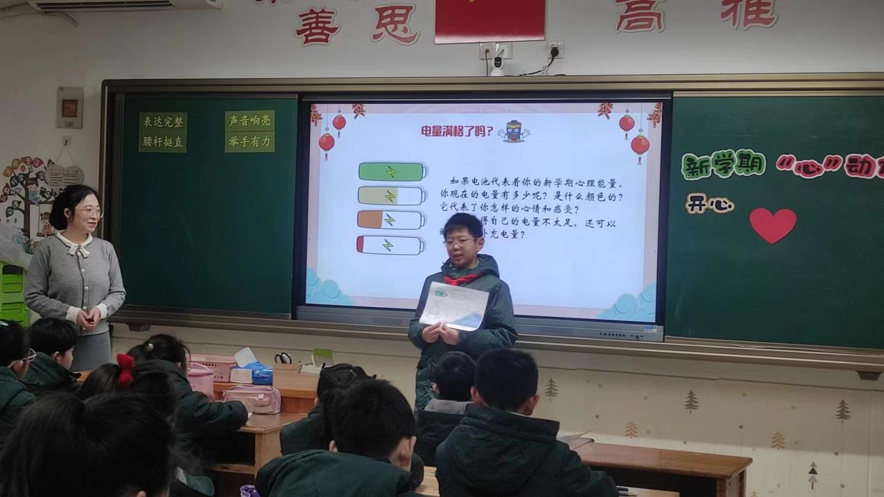 21日,在南京市金陵中学河西分校小学部的开学第一课上,二(5)班的学生们正在以传递“小龙人”的方式互相倾诉开学心情。四(10)班的班主任王雪正在组织学生们在纸上的电池图形中填充上自己目前的“电量”,在通往“山顶”的旗帜上写上自己的学期目标。“我希望新的学期,写字越来越好看,多做锻炼让身体更强壮,多帮助他人。”学生王铭义的新年愿望引得全班阵阵掌声。该校学生工作处主任夏成君表示:“学生的心理健康可以从课堂上反映出来,其中有孩子比较焦虑、紧张,我们希望通过这样独特的‘收心’开学第一课调整学生的情绪,拉近师生的距离,给予他们心理支持和指导,帮助他们更好地迎接新学期。”