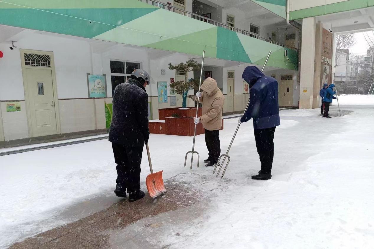 “雪还没停,学校的教职工们就来学校扫雪了!”徐州市解放路小学大队辅导员郑瑜洁告诉记者,21日下午5点左右,天空依然飘着雪花。经过昨夜的大雪,校园里覆盖了厚厚一层积雪,加上冻雨的影响,路面湿滑,存在着严重的安全隐患。中午,教职工们扛起铁锹、扫帚,开始在校园里对积雪和冰块进行清扫,有些积雪在低温下冻得发硬,教职工们拿着铁锹用力敲破冰面坚持清理。在忙碌了近5个小时后,一条干净的路面被清理出来。一名教师搓了搓通红的双手,跺了跺满是雪的鞋子,说:“只要孩子们能安全上学,我们的心就是暖暖的。”
