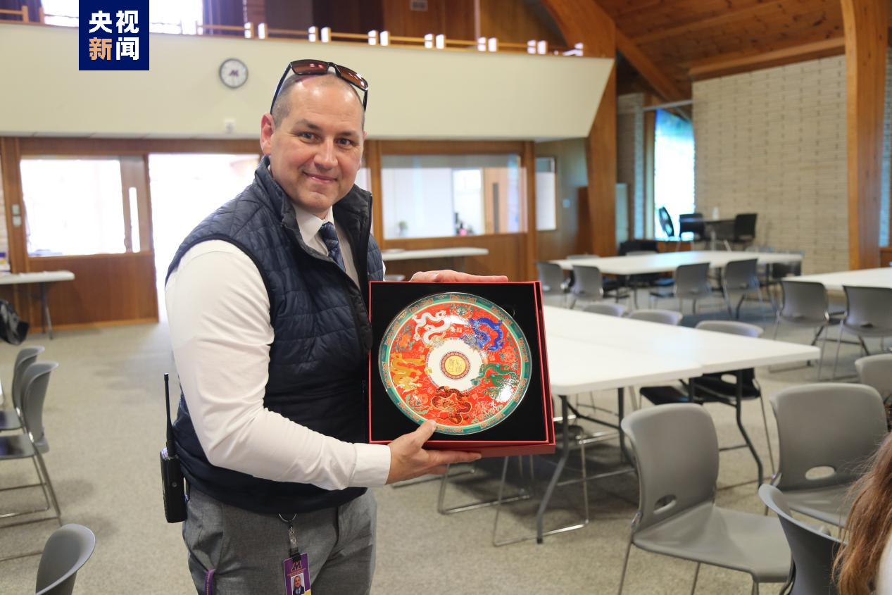 △马斯卡廷中学高中部校长瑞安·卡斯尔代表学校接受总台文创产品