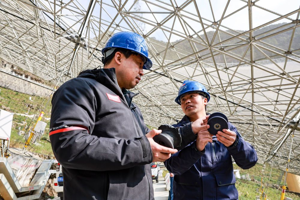 姜鹏(左)在贵州“中国天眼”的反射面板下与工作人员交谈(2023年2月13日维护保养期间拍摄)。新华社记者 欧东衢 摄