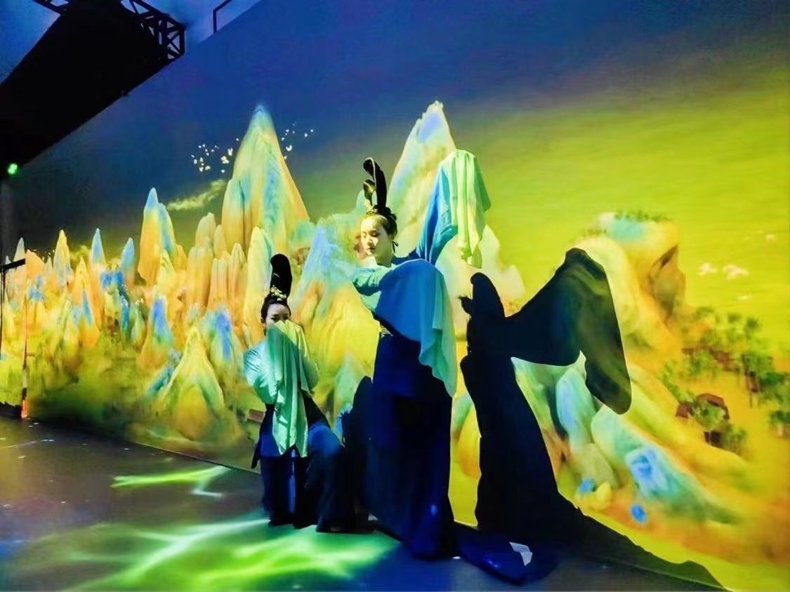 今年,市博物馆在特展《盈尺纵横·妙合无垠——盐城市博物馆馆藏扇面展》的基础上,推出了盐城首个沉浸式数字大展《瑰丽·千里江山——观念式数字意境展》。