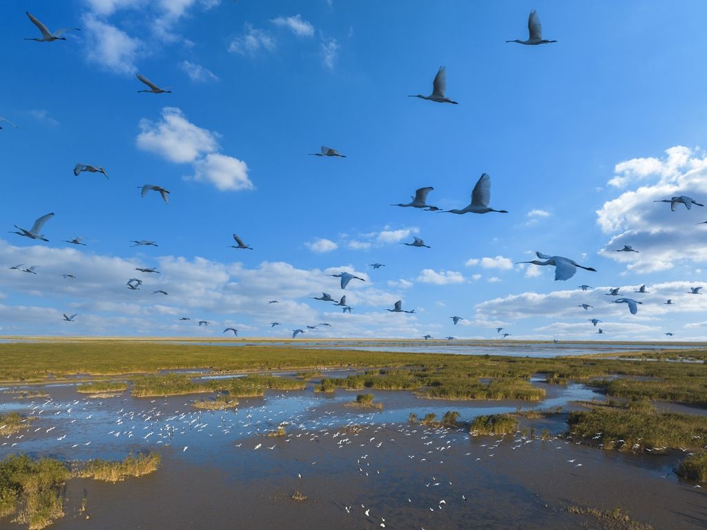 582公里的海岸线,绵延着一道绿色屏障。海陆之间,绿色充盈,群鸟起落其中。
