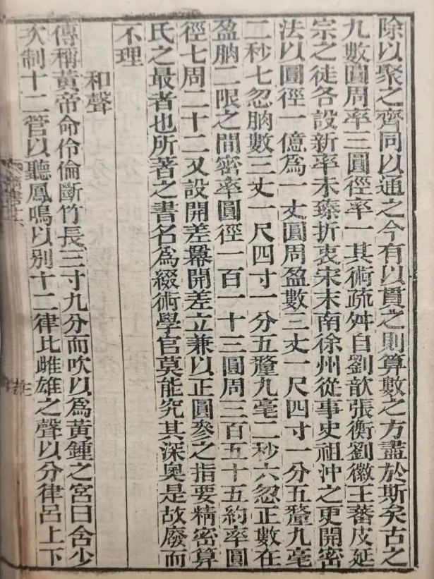 “古之九数,圆周率三,圆径率一,其术疏舛。自刘歆、张衡、刘徽、王蕃、皮延宗之徒,各设新率,未臻折衷。宋末,南徐州从事祖冲之更开密法。以圆径一亿为丈,圆周盈数三丈一尺四寸一分五厘九毫二秒七忽,朒数三丈一尺四寸一分五厘九毫二秒六忽,正数在盈朒二限之间。密率:圆径一百一十三,圆周三百五十五。约率,圆径七,周二十二。”
