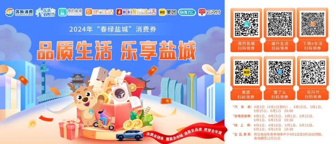 记者从市商务局获悉,4月1日起,我市在“我的盐城”等多个平台,分批次发放近2亿元消费券,其中住宿餐饮、零售百货等全品类券1.62亿元,汽车消费券、家电家居等大宗品类消费券3500万元。作为“春绿盐城”消费券发放主要平台,“我的盐城”当天首批发放大宗品类消费券450万元,每人最高可享2500元优惠。