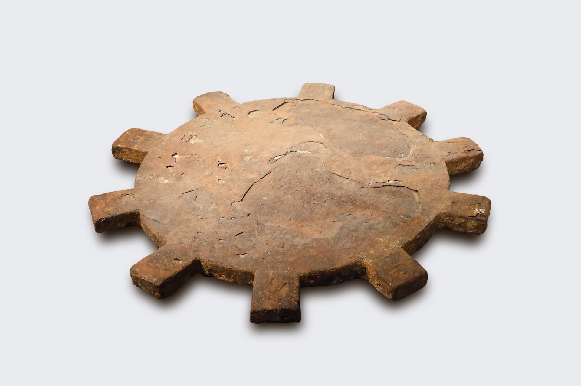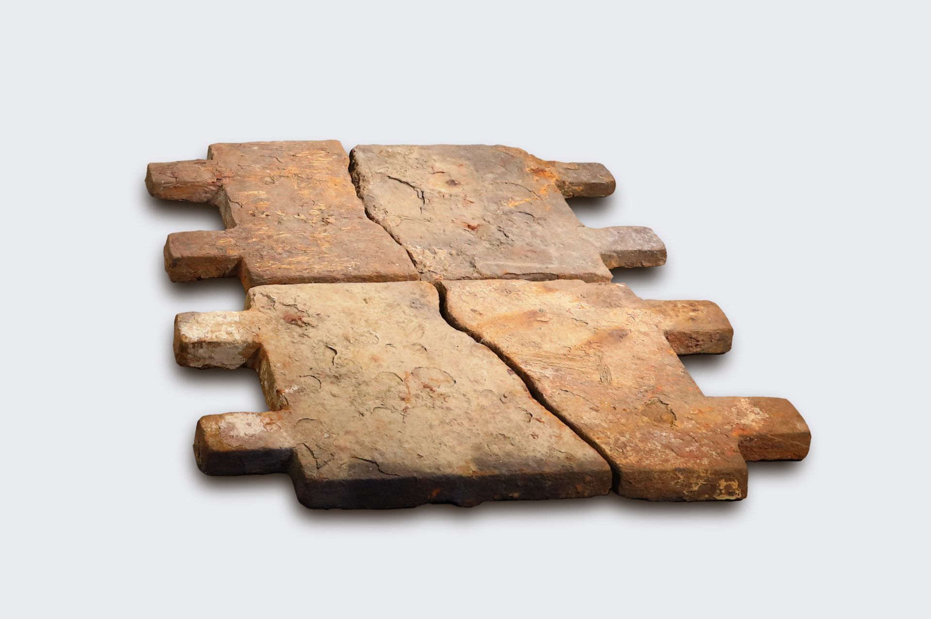 唐代盐城境内设立盐城监、海陵监,正是利用这样体形大、产量高的盘铁,才使得这两所盐监每年的盐产量达到全国之最。国家赋税,盐利居半,盐城所产的淮盐在当时占到全国盐税的一半,盐城也因此一跃成为“上县”。北宋之后出现切块盘铁,主要原因是为了防止盐民掌握生产工具后私自煮盐,所以将整块盘铁分割下来发到每一户人家保管,等到煎盐的时候,再将切块盘铁拼成整块。同时由于盘铁厚重、硕大,为了提高生产效率,必须扩大盘铁的面积,但每一次熔化的铁水受到局限,只好将大盘铁分块浇铸,用时再组合成大盘铁。