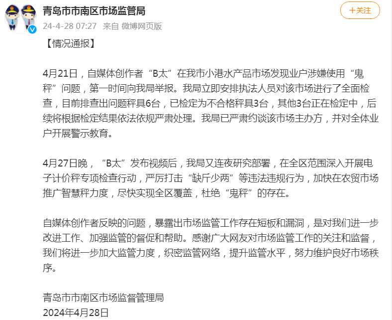 4月27日晚,“B太”发布视频后,我局又连夜研究部署,在全区范围深入开展电子计价秤专项检查行动,严厉打击“缺斤少两”等违法违规行为,加快在农贸市场推广智慧秤力度,尽快实现全区覆盖,杜绝“鬼秤”的存在。