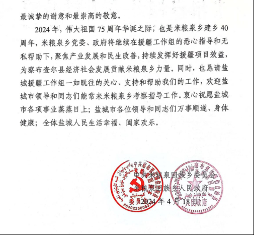 盐察万里不隔浓浓情谊,大爱援疆结出累累硕果。近日,江苏援伊·盐城工作组收到一封来自受援地察布查尔县米粮泉回族乡的感谢信,信中的文字朴实,真情满满,向盐城工作组为当地乡村振兴所作出的重要贡献表示衷心感谢和崇高敬意。