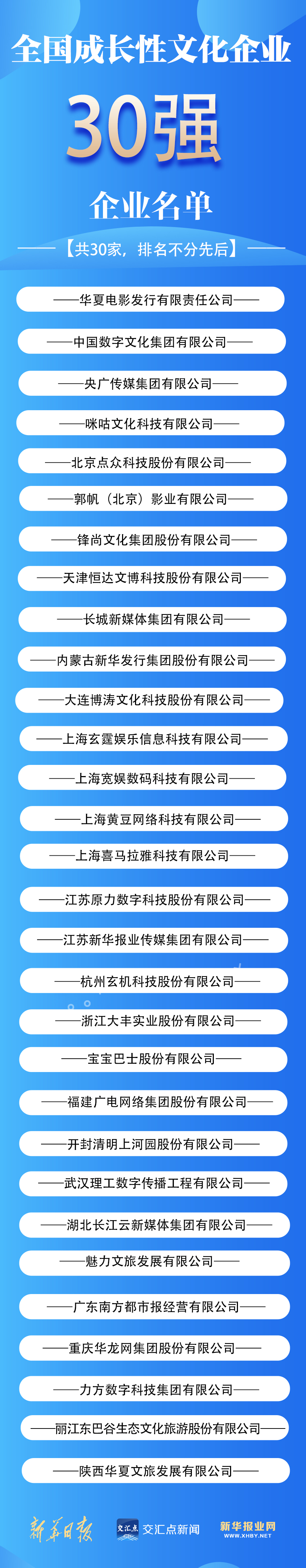 “全国文化企业30强”是反映我国文化产业发展和文化企业规模实力的重要品牌。今年起,光明日报社和经济日报社不再发布“全国文化企业30强”提名企业,改为发布“全国成长性文化企业30强”。聚焦文化领域新业态、新模式快速健康发展,以及文化科技创新成果不断涌现良好态势的文化企业,进一步突出标志性和引领性,激励文化企业更好地把社会效益放在首位、社会效益和经济效益相统一。