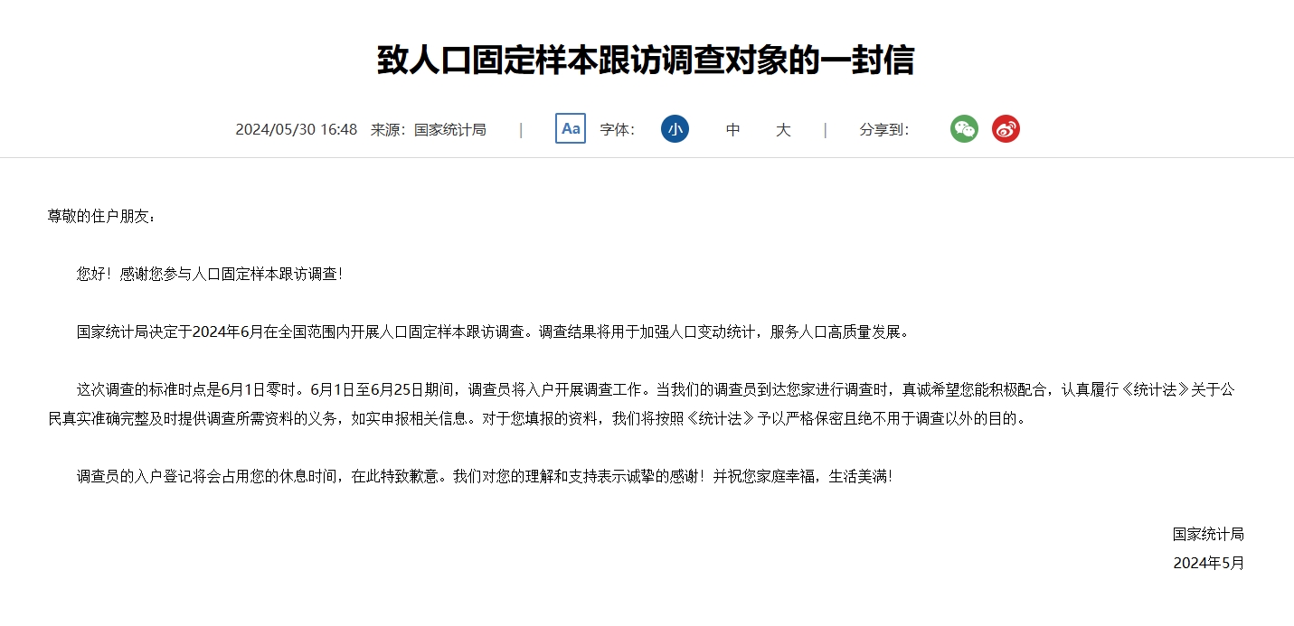 据国家统计局网站消息,国家统计局决定于2024年6月在全国范围内开展人口固定样本跟访调查。调查结果将用于加强人口变动统计,服务人口高质量发展。
