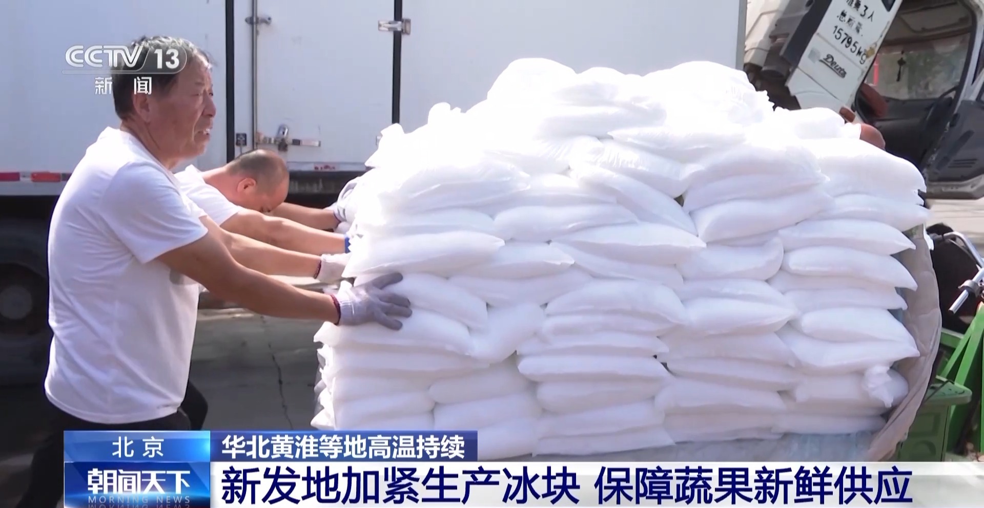 连日来,北京持续出现高温天气。在北京新发地市场,制冰场正开足马力加紧生产冰块,满足市场蔬菜、水果的保鲜用冰需求。