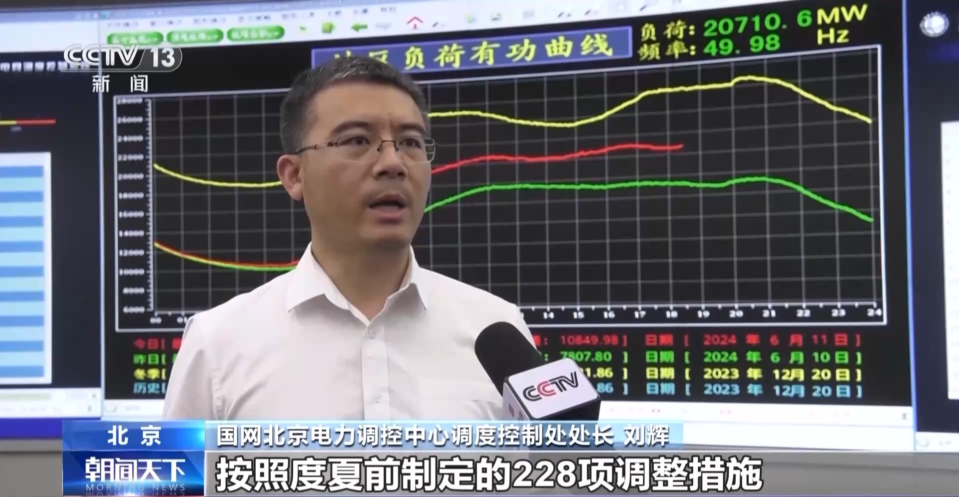 国网北京电力调控中心调度控制处处长 刘辉:按照度夏前制定的228项调整措施,实时优化电网运行方式。目前,电网整体运行平稳,电力供应充足有序。