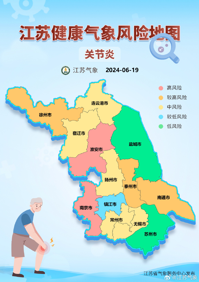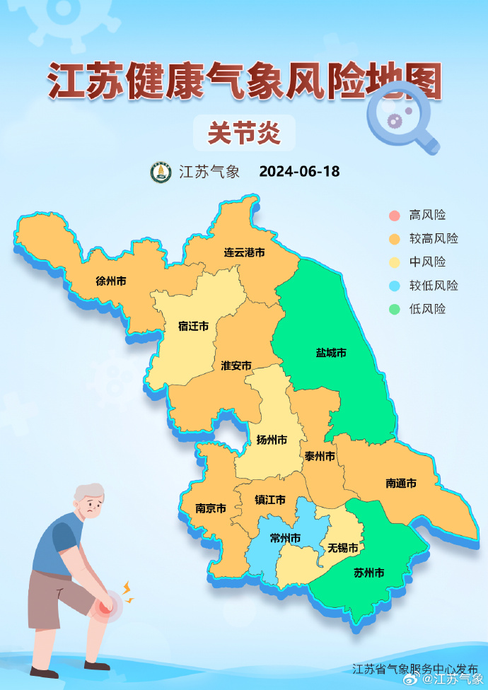 另据江苏省气象服务中心发布的江苏健康风险地图,根据未来气象条件,预计18日—19日,江苏关节炎疾病发病风险较高,预计全省部分地区风险等级可达较高风险,建议关注天气变化,适当进行户外锻炼,并保证充足的睡眠、合理饮食、心情舒畅。