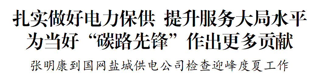 张明康指出,当前,我市已全面进入仲夏时节,气温逐步攀升。同时,企业生产、项目建设也处于冲刺发展关键节点。国网盐城供电公司要全力以赴做好迎峰度夏工作,认真分析可能面临的严峻形势,充分使用调度现有电力资源,加强与市相关部门协同合作,强化“快上快下”企业业务指导,加大电网设备巡查监测,确保电力安全可靠供应、电网平稳度夏、全社会用电安全。要坚持服务推动绿色低碳发展,探索绿电优先供给企业机制,主导开展(近)零碳产业园智慧电网建设,加快区域性智能电网组网创新,深入研究新型储能方式,贡献更多绿色低碳发展电力创新方案。要精心谋划未来长远发展,超前谋划“十五五”发展规划研究编制工作,积极向上争取重大项目和资金支持,全面提升绿色能源利用水平,加快构建更加坚强、更加智慧的电网体系,不断提高全市域电力保障水平。要坚决守牢电力安全底线,坚持首保大电网安全,严格日常生产组织和现场风险管控,深化客户侧用电安全宣传管理,建立健全电力保供和应急救援机制,全面提高应对突发事件能力。