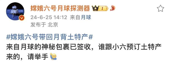“来自月球的神秘包裹已签收,谁跟小六预订土特产来的,请举手。”