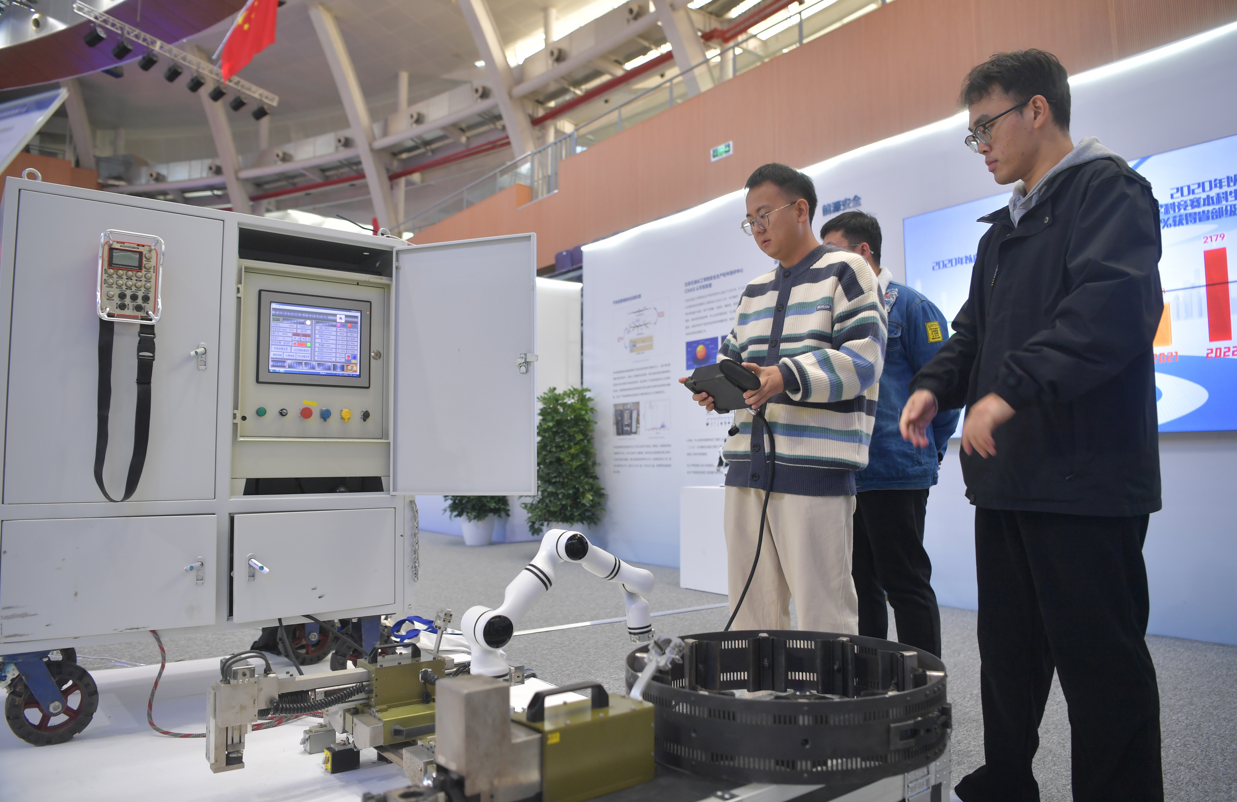 2023年,京南地区高校科技成果推介会在北京建筑大学大兴校区举行。图为高校师生在展示管道全位置焊接机器人系统成果。