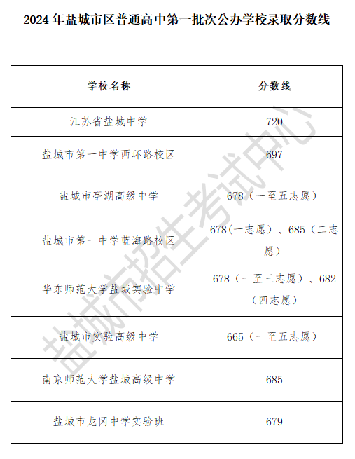 2024年盐城市区普通高中第一批次公办学校录取分数线公布。