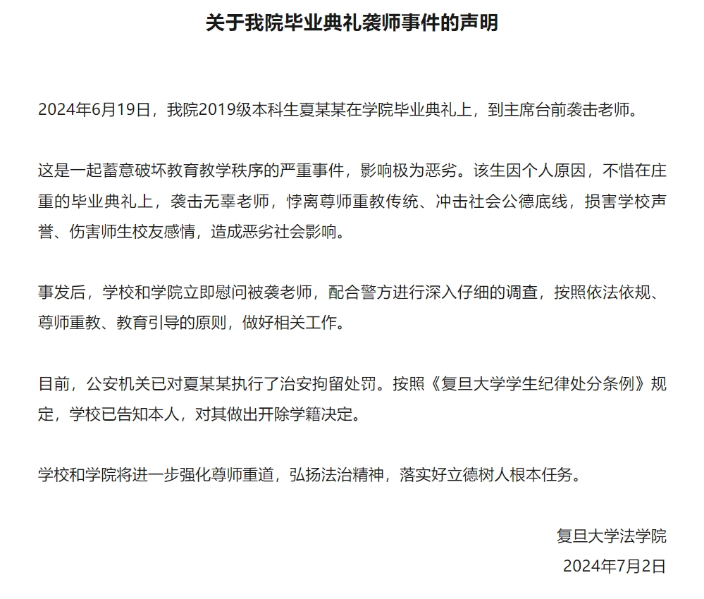 关于我院毕业典礼袭师事件的声明