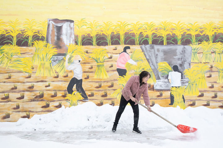 黑龙江省漠河市北极镇北红村“远方故里”民宿负责人张翠花在清理积雪(2023年1月12日摄)。新华社记者 张涛 摄