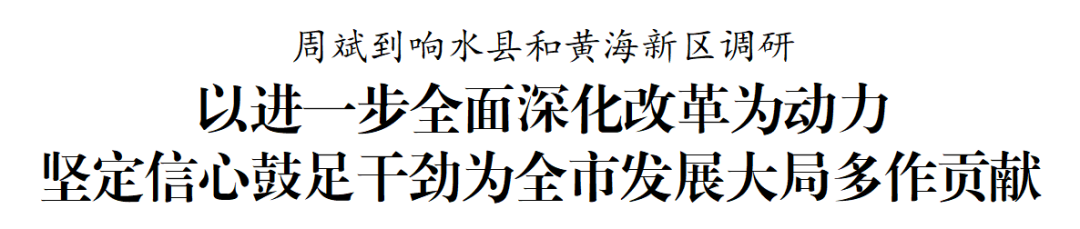 8月12日至13日,市委书记周斌到响水县和黄海新区调研。他强调,要坚持以习近平新时代中国特色社会主义思想为指导,认真学习贯彻党的二十届三中全会精神,自觉把改革摆在更加突出位置,完整准确全面贯彻新发展理念,加快经济社会发展全面绿色转型,更好统筹发展和安全,坚定信心、鼓足干劲,努力为全市经济发展大局多作贡献。