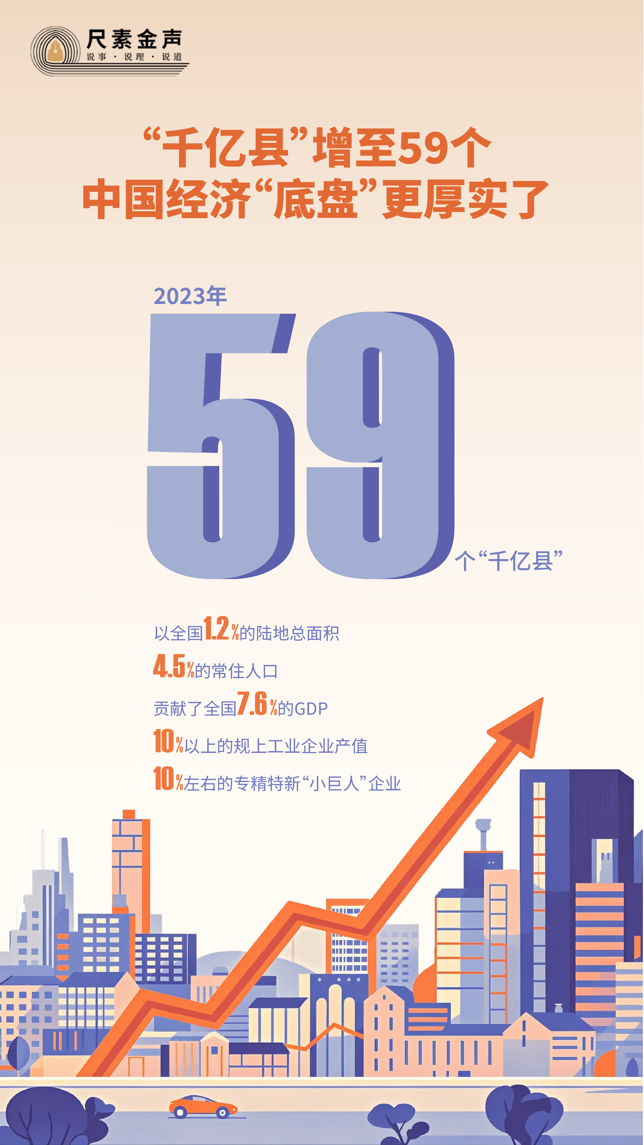 ——经济实力更强了。去年,59个“千亿县”以全国1.2%的陆地总面积、4.5%的常住人口,贡献了全国7.6%的GDP、10%以上的规上工业企业产值、10%左右的专精特新“小巨人”企业。
