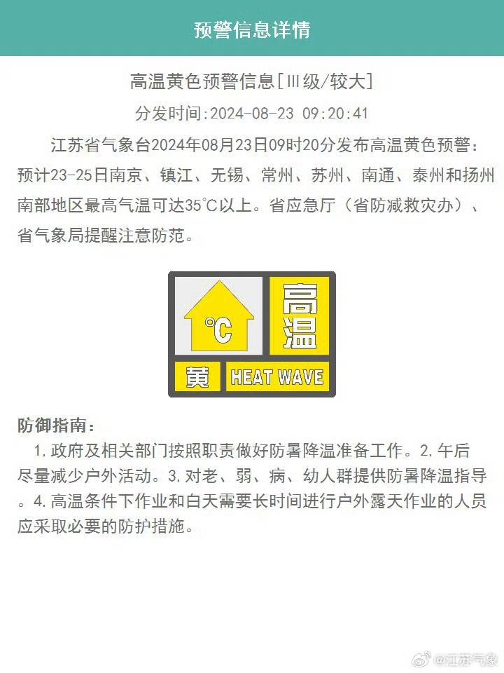 交汇点讯 8月23日09时20分,江苏省气象台发布高温黄色预警:预计23-25日南京、镇江、无锡、常州、苏州、南通、泰州和扬州南部地区最高气温可达35℃以上。省应急厅(省防减救灾办)、省气象局提醒注意防范。