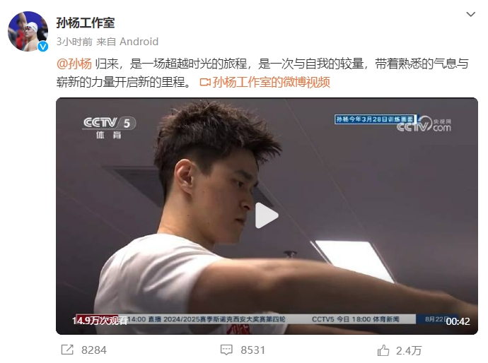 @孙杨工作室 发文称:“孙杨归来,是一场超越时光的旅程,是一次与自我的较量,带着熟悉的气息与崭新的力量开启新的里程。”