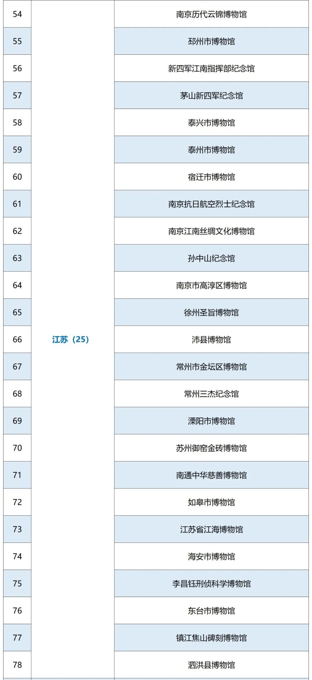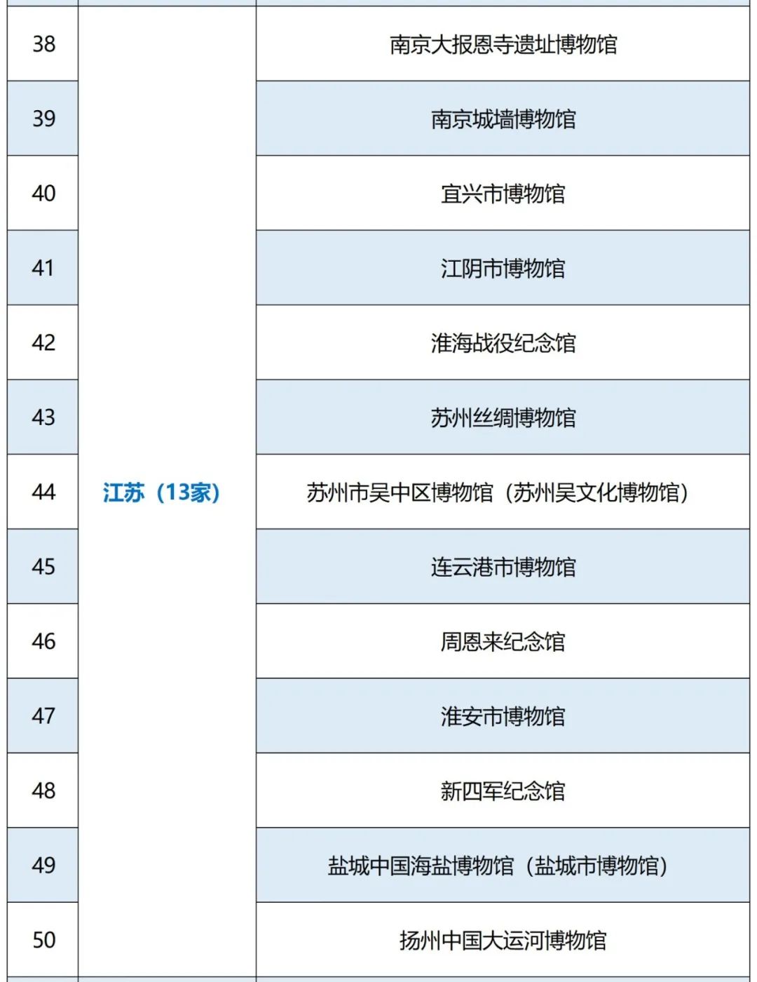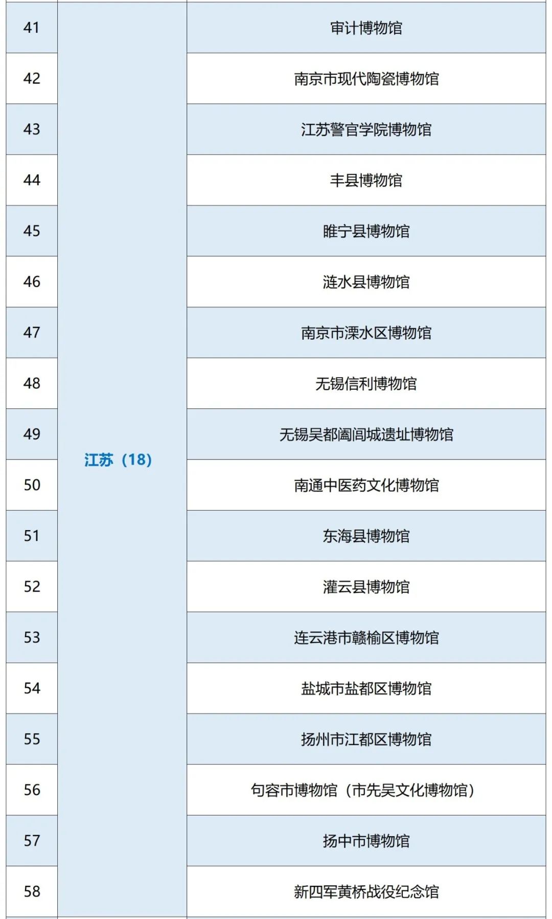 8月23日,中国博物馆协会公布了第五批全国二、三级博物馆定级评估结果,江苏43家博物馆单位通过评定,其中25家单位被评定为国家二级博物馆,18家单位被评定为国家三级博物馆。此前的5月8日,江苏的扬州中国大运河博物馆等13家单位已定级国家一级博物馆。