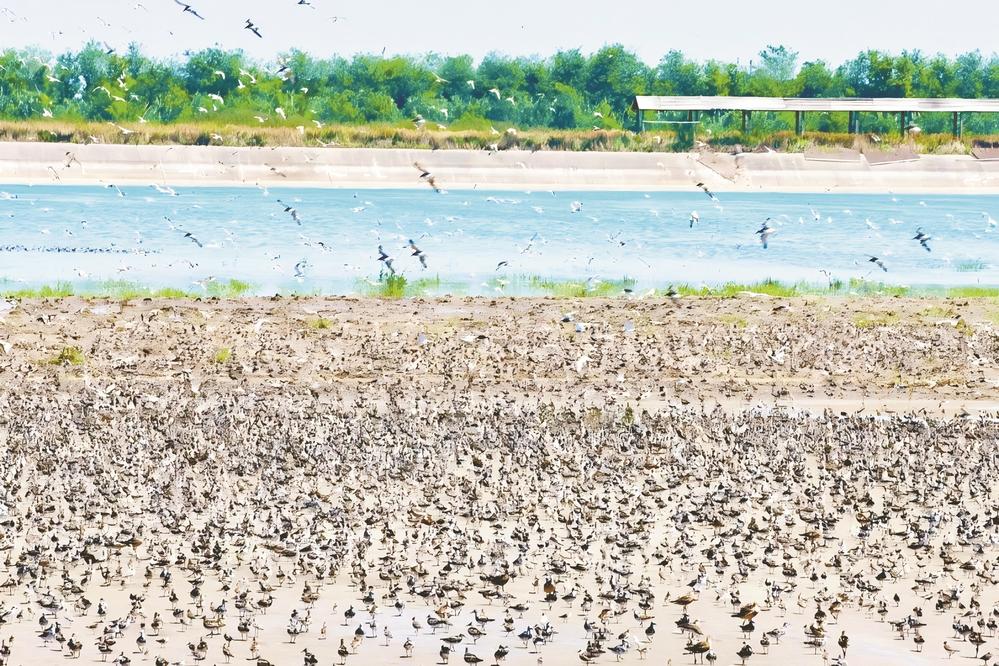 科研人员还在调查中观测到,这些鸻鹬类迁徙大军中,不乏勺嘴鹬、小青脚鹬、黑脸琵鹭等极危、濒危明星物种,其中国家一级保护动物小青脚鹬达1630只。它们时而展翅飞翔,时而聚集水面,如同精灵在湿地的水草间穿梭跳跃,叽叽喳喳,热闹非凡。
