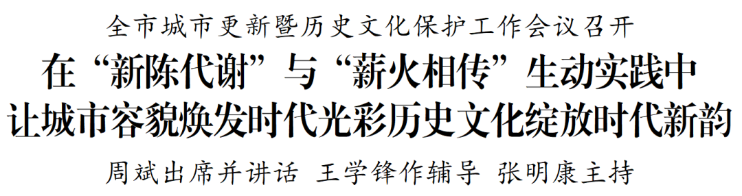 周斌指出,城市是现代化建设的重要载体,文化是一个地方的根与魂,城市更新与历史文化保护密不可分。各地各部门要站位全局、着眼长远,切实增强做好城市更新和历史文化保护工作的使命感责任感,精准把握城市发展规律,把城市更新作为扩内需、稳增长、惠民生的重要抓手,坚定文化自信创建历史文化名城,在城市更新“新陈代谢”与历史文化“薪火相传”生动实践中,推动城市高质量可持续发展。