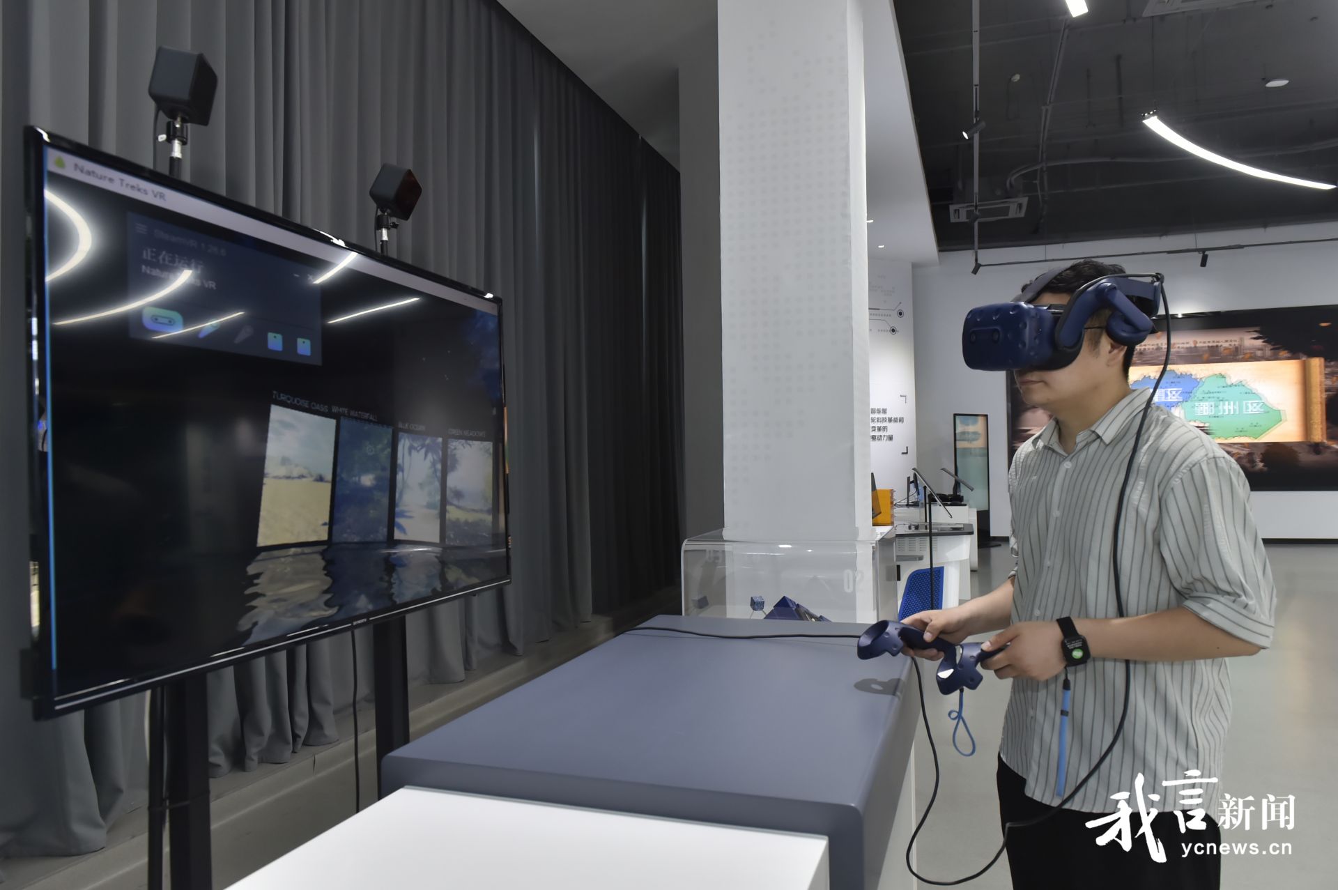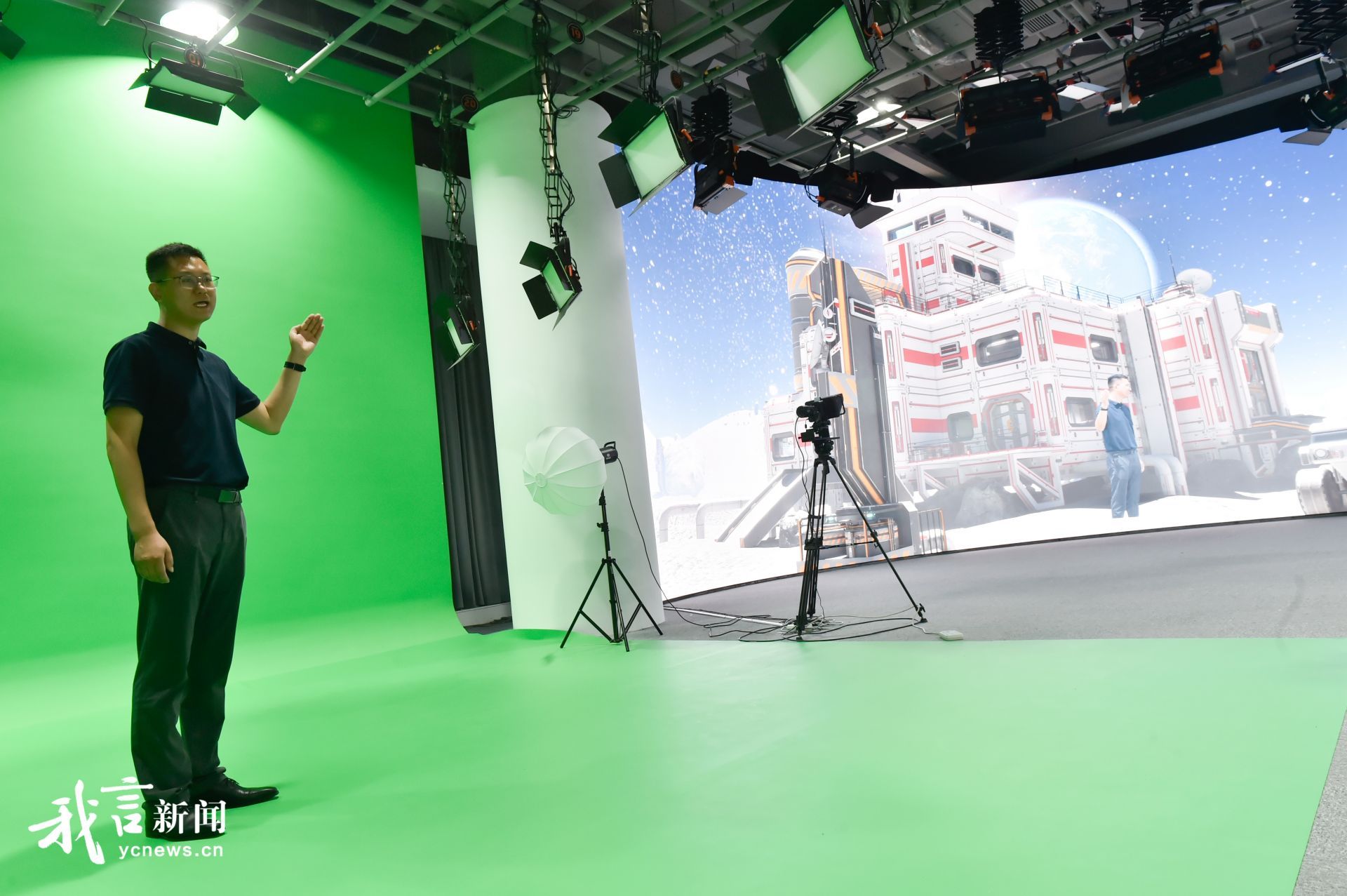 而在另一片绿幕前,张驰向记者展示了最新的影视制作效果。他站在指定区域,对面的大屏上却出现了外星球宇宙飞船的背景。这些背景可以根据实际需求进行更换。